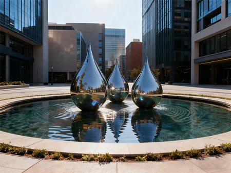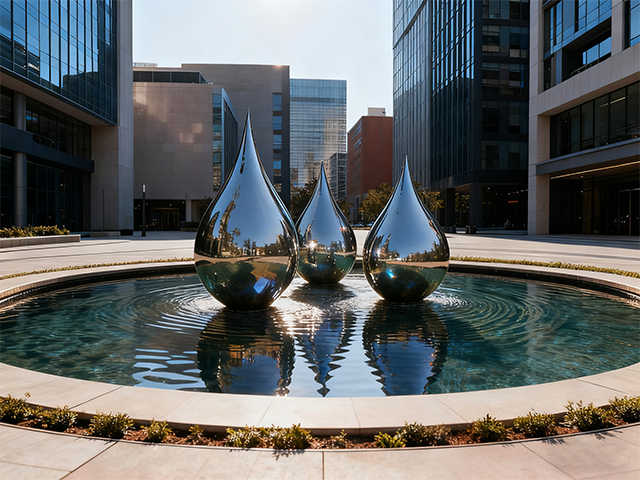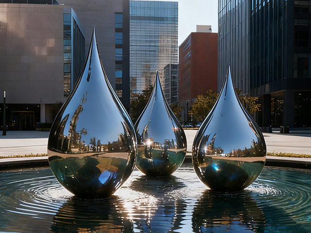 雕塑形态与材质:以水滴为造型,采用不锈钢材质,具有强烈的现代感与精 致感。水滴形态象征着纯净、灵动,不锈钢雕塑的镜面效果则能反射周围的建筑、水景与天空,形成虚实交融的视觉效果,增强了空间的互动性与艺术氛围。