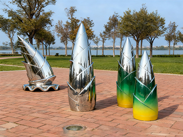 这件南京不锈钢雕塑以竹笋为创作原型。竹笋的形态本身承载着 “蓬勃生长、节节高升” 的文化意象,象征着生命的活力与向上的精神。雕塑通过对竹笋较为写实的表达,将自然物象通过不锈钢的载体转化为具有视觉冲击力的艺术符号,赋予其现代感,暗合城市发展中对自然意象的诗意化重构。