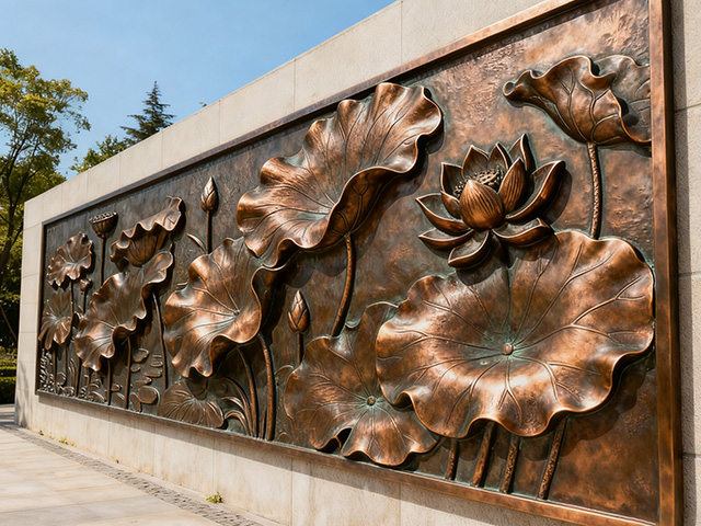 玻璃钢浮雕,高3.9米,博物馆内摆放。这块玻璃钢浮雕经泥塑创作-玻璃钢翻制-表面仿青铜着色而成。玻璃钢浮雕的主题为《古蒙神韵》,选用青铜色契合浮雕主题,突出历史感,厚重感。