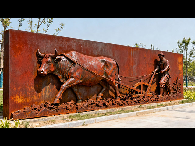 这件农耕雕塑,生动再现了传统农耕场景中 “牛拉犁耕作” 的画面。耐候钢雕塑精 准刻画了牛耕的核心元素:壮硕的耕牛肌肉线条分明,犄角遒劲;紧跟其后的是手握犁具专注引导的农夫,农夫头戴帽子、卷起衣袖裤脚;脚下是正在被翻整的土地;整个场景通过不同程度的浮雕刻画,让耕牛、农夫、犁具与土地的层次立体分明,增强了场景的纵深感与真实感。在材质上采用耐候钢与铸铁两种材质工艺,其斑驳的锈色质感,既模拟了土地的肌理与岁月的痕迹,又赋予雕塑历史的厚重感,仿佛将农耕文明的悠久历史凝缩于其中。 这样的一件农耕雕塑传递着农耕劳动中 “勤勉坚韧” 的精神内核,提醒人们回望农业文明的根基,思考传统生产方式中人与自然的和谐共生关系 —— 耕牛与土地的互动、农夫对天时地利的顺应,都暗含着 “天 人 合 一” 的生态智慧。同时,它也搭建起当代人与农耕历史的情感连接,无论是乡村长大的观者对童年农事的回忆,还是城市人群对农耕文明的好奇探索,都能在这件雕塑中找到连接,成为传承农耕文化、唤醒乡土情怀的艺术媒介。