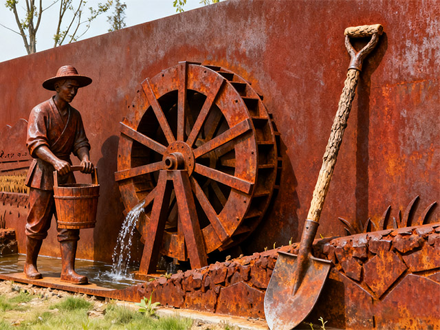 耐候钢雕塑,农耕主题,人物雕塑及土地为铸造工艺,背景墙为耐候钢板焊接制作,内置骨架支撑。