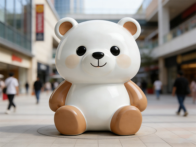 这个摆放在商圈公共空间的玻璃钢小熊雕塑,是典型的 “治 愈系商业 IP 装置”。 从视觉上看,它以白、浅棕为主色调,采用圆润饱满的卡通造型:圆脑壳、大萌眼搭配淡粉腮红,弱化了雕塑的硬质边界,自带软萌亲和力。这种设计精 准契合商圈的空间属性 —— 既填补了公共区域的视觉空白,又能成为消费者(尤其是年轻群体、亲子客群)的打卡点,通过 “可爱感” 降低商业空间的冰冷感。 其核心作用是传递情绪价值:在快节奏的消费场景里,软萌的玻璃钢雕塑小熊形象能快速唤起愉悦、放松的情绪,契合当下 “解压式消费” 的心理需求。同时,这类轻量化的艺术装置,也是商圈打造 “年轻化、休闲化” 定位的符号之一,用轻松的视觉语言拉近与消费者的距离,让公共空间从 “通行场所” 变成兼具审美与互动性的体验节点。